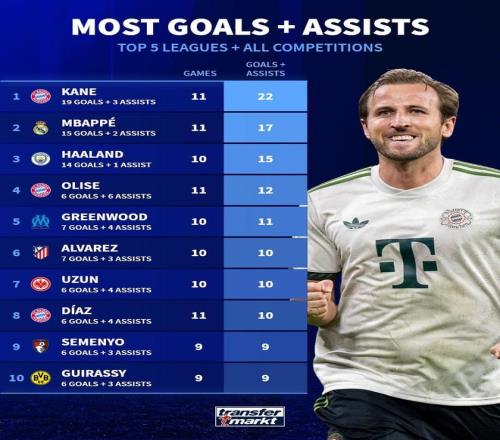 1.凯恩 22球 拜仁 (11场比赛19球3助攻)