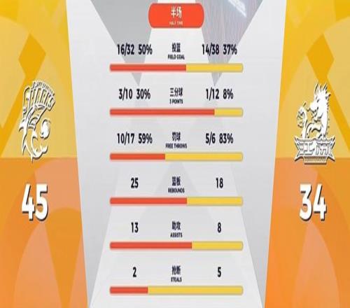 半场战罢,上海男篮45比34领先,江苏队半场投篮命中率不足4成,3分球更是12投1中,整体手感糟糕。