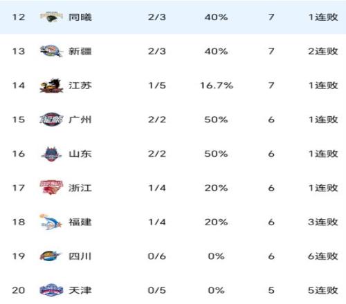 前五轮过后,只有北京队、广东队开局五连胜,青岛队、辽宁队、广厦队、山西队都是4胜1负战绩,另外天津队、四川队继续全败,未能收获一场胜利。