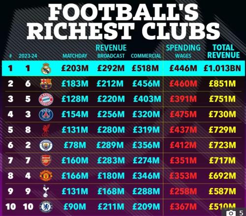 金钱联赛:皇马笑傲世界,英超垄断第二梯队